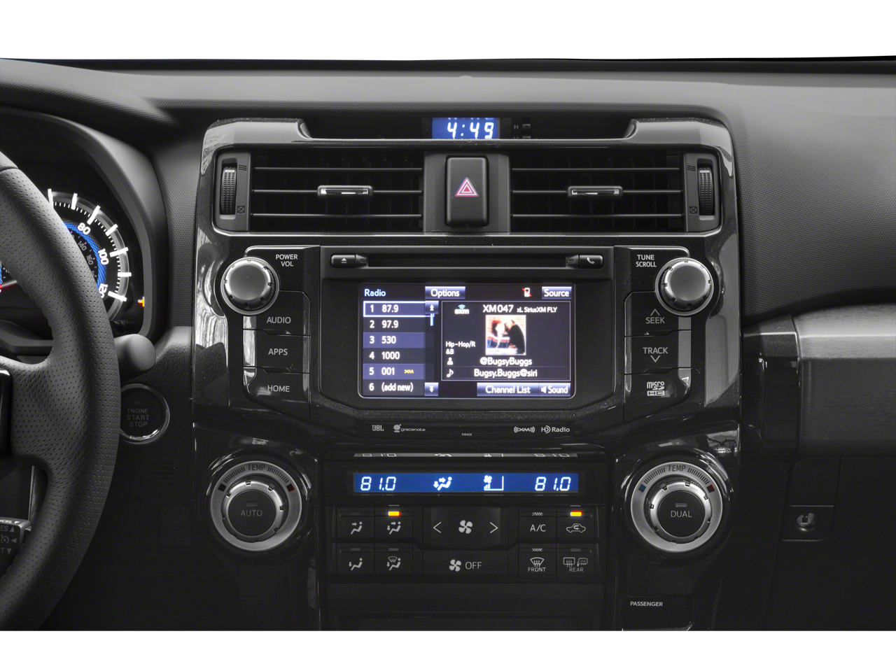 - Radio: Entune Premium JBL Audio w/Navigation -inc: Entune App Suite, 6.1" high-resolution touch-screen w/split-screen display, AM/FM cache radio, HD Radio, CD player, 15 JBL GreenEdge speakers including subwoofer amplifier, auxiliary port, USB 2.0 port w/iPod connectivity and control, advanced voice recognition, hands-free phone capability, phone book access and music streaming via Bluetooth® wireless technology, Siri Eyes Free, HD Radio predictive traffic and Doppler weather overlay, and SiriusXM satellite radio w/3-month all access trial Access to Entune services is subscription free. See toyota.com/entune for details.